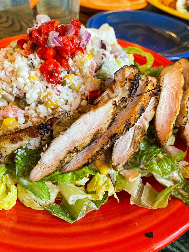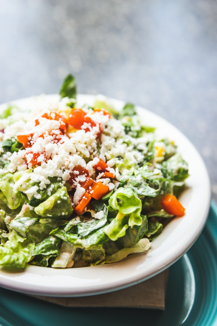 romaine, chopped tomato, jicama, sweet onion, avocado, scallions, garbanzo beans, cucumbers, corn, roasted red peppers and queso fresco tossed in a chipotle ranch dressing.