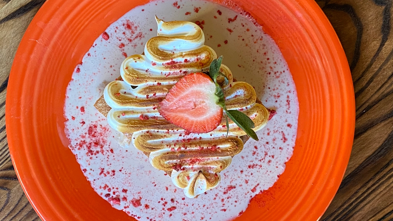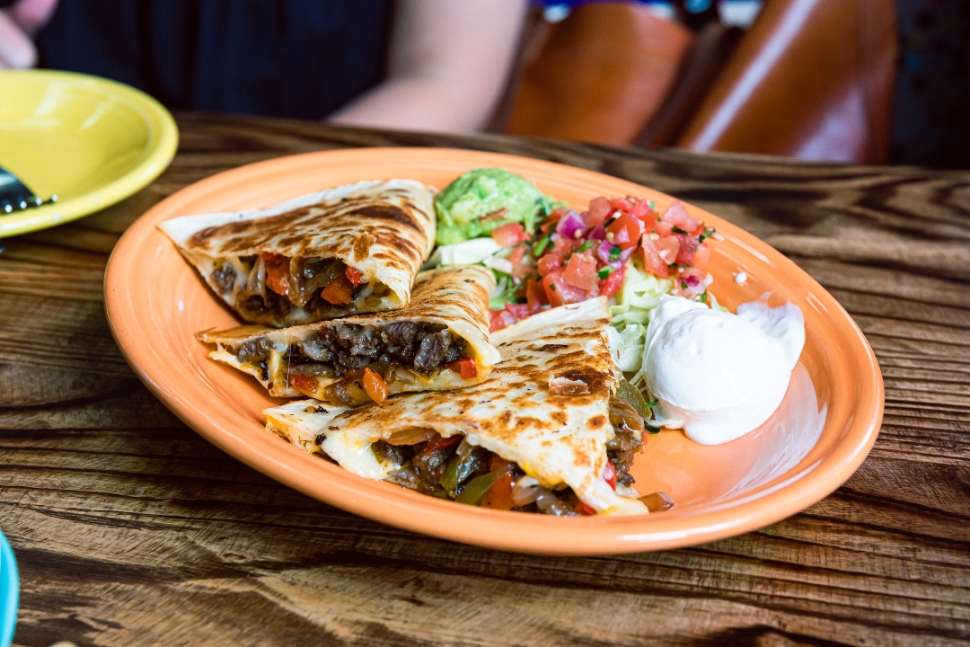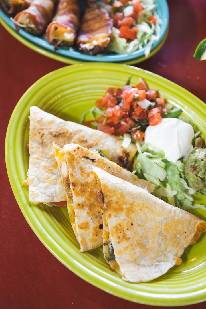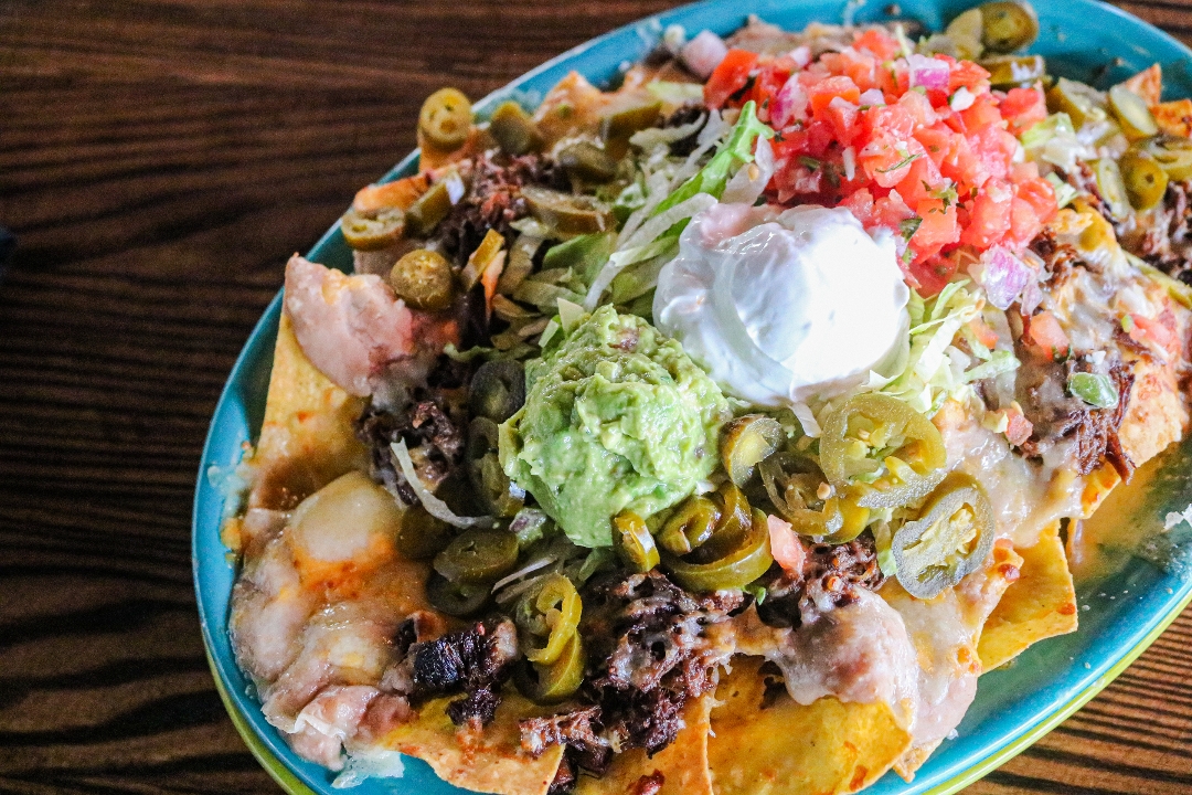 roasted chicken, fresh spinach and mixed cheese. Topped with chili con queso, finished with avocado and red pepper crema