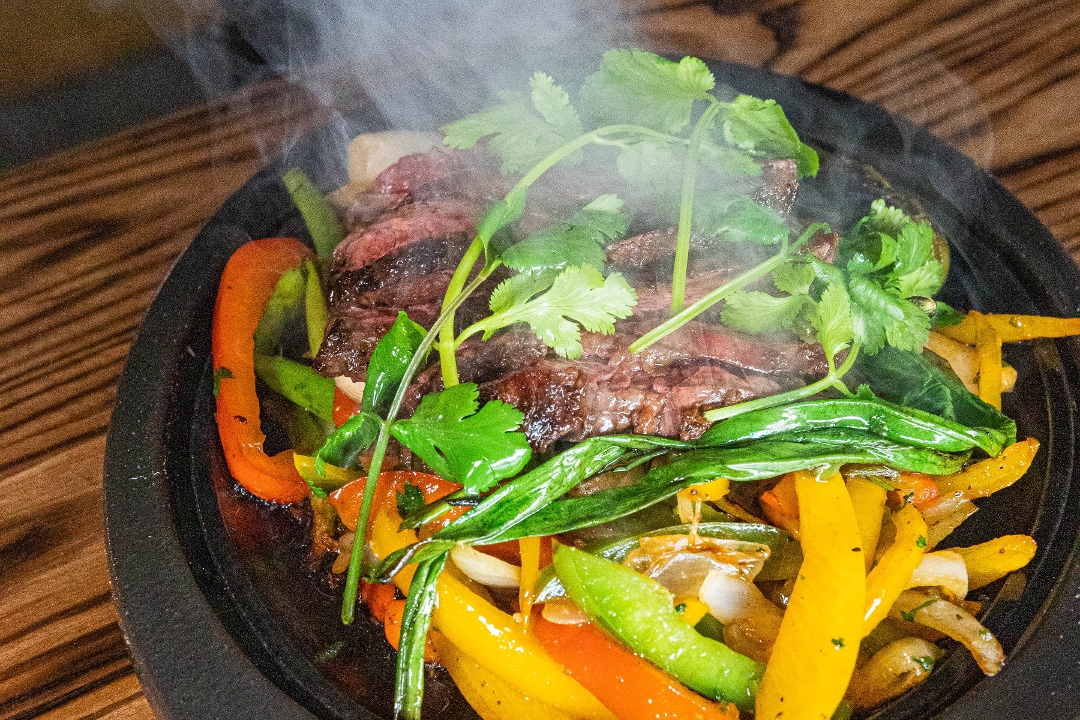 with bell peppers, onions, wood grilled skirt steak and mixed cheese.