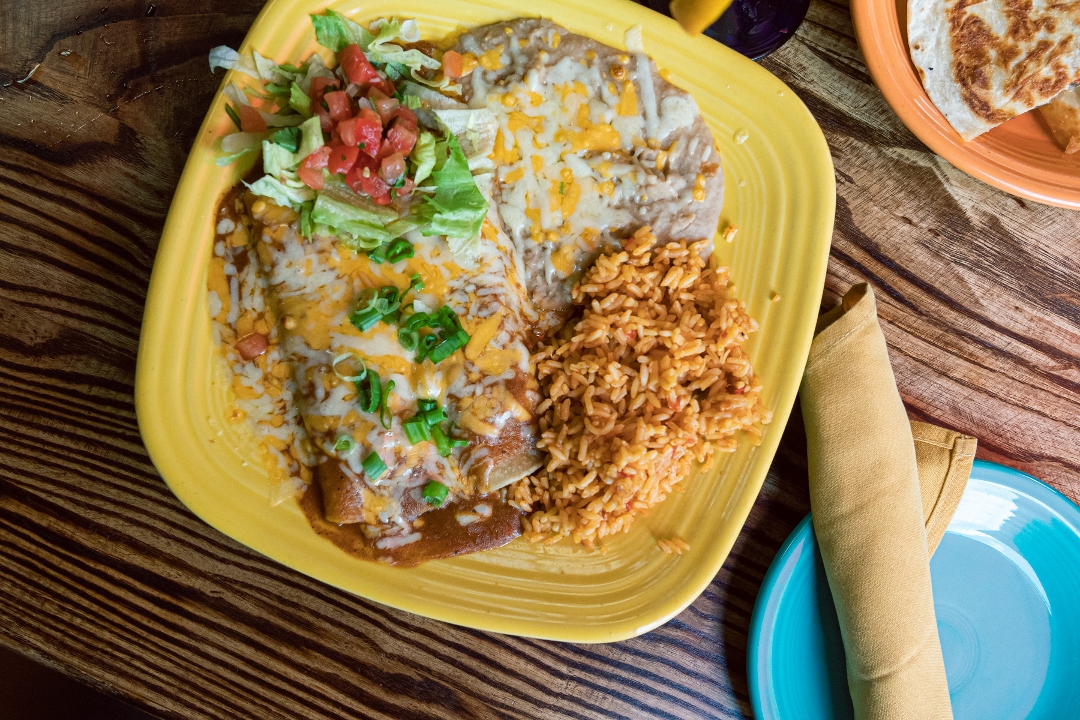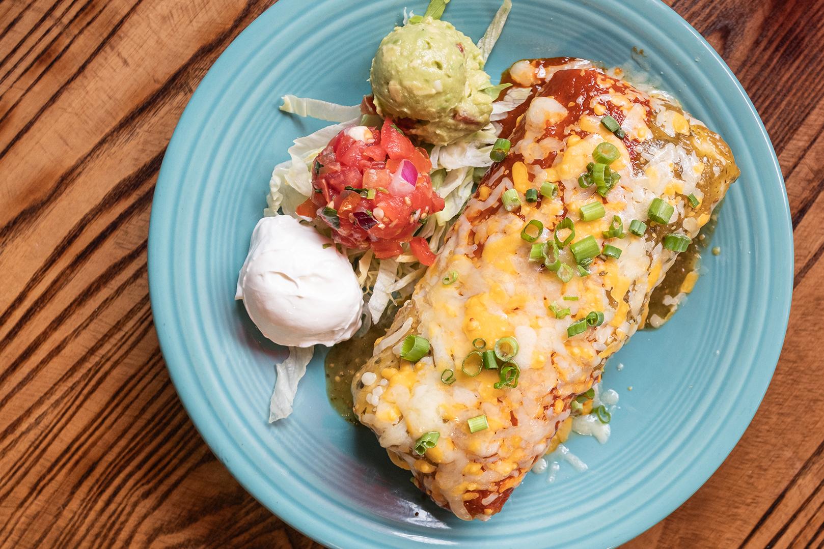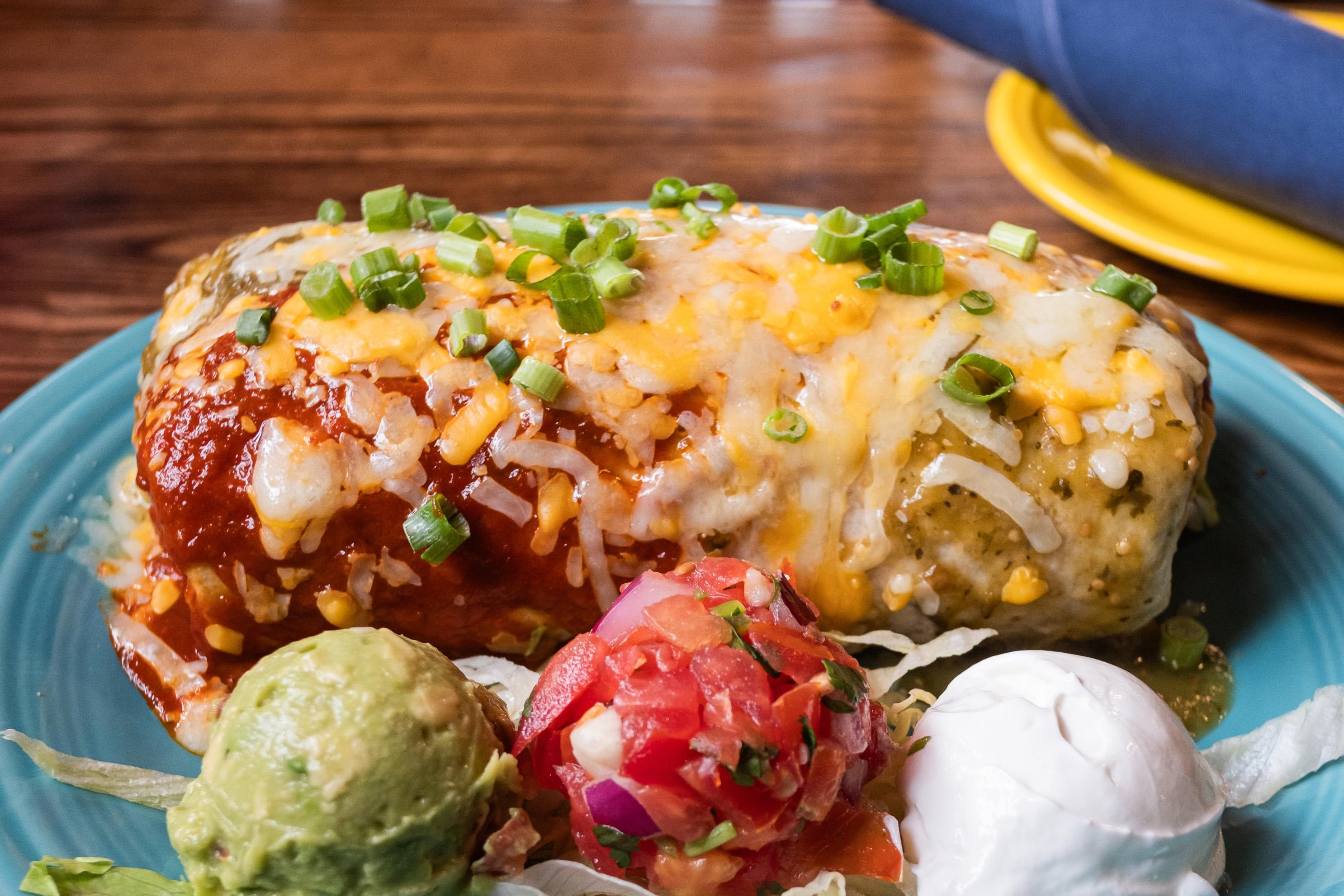 flour tortilla stuffed with caramelized onions, bell peppers, red rice and ground beef. Smothered with red and green enchilada sauces and melted mixed cheese.