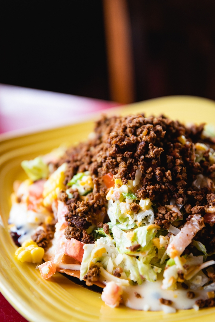 no tortilla! Layers of cabbage, red rice, black beans, corn, pico de gallo, mixed cheese, avocado and sour cream