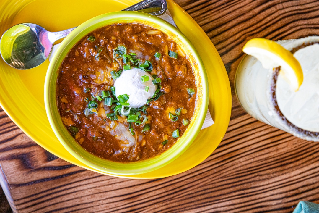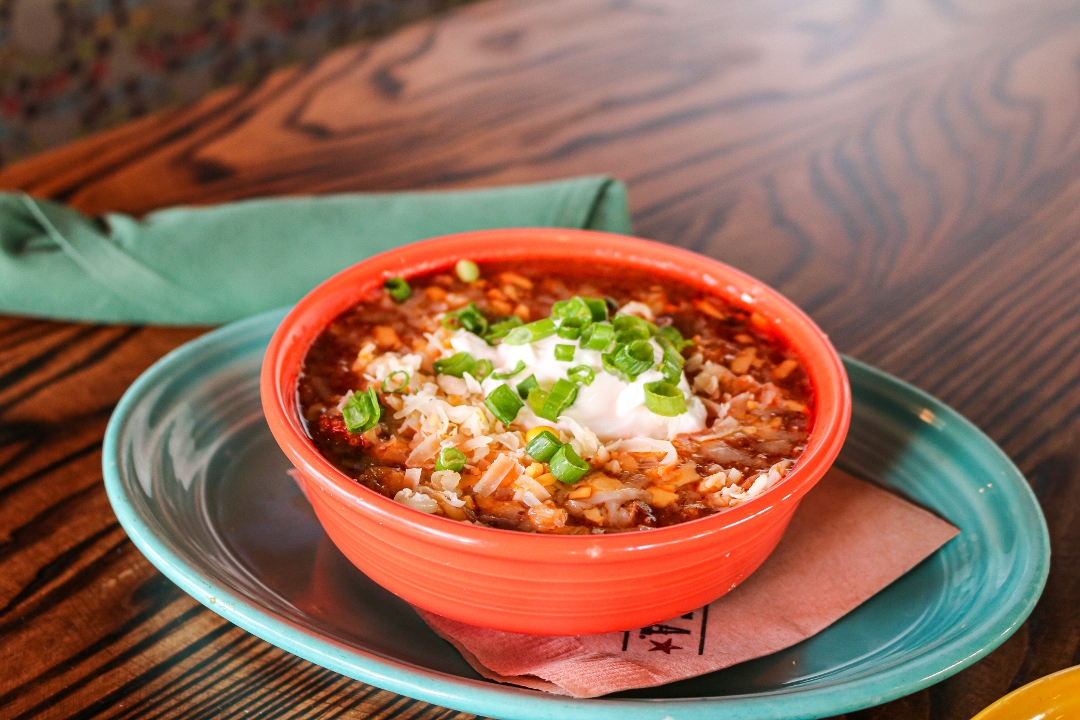 topped with our signature Texas beef chili, cilantro and chopped raw onions