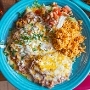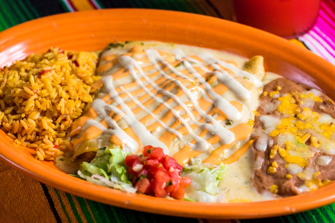 a crispy burrito filled with ground beef, refried beans, pico de gallo, red rice and mixed cheese. Topped with salsa roja and groli con queso. Served with sour cream, guacamole, lettuce, pico de gallo and red rice