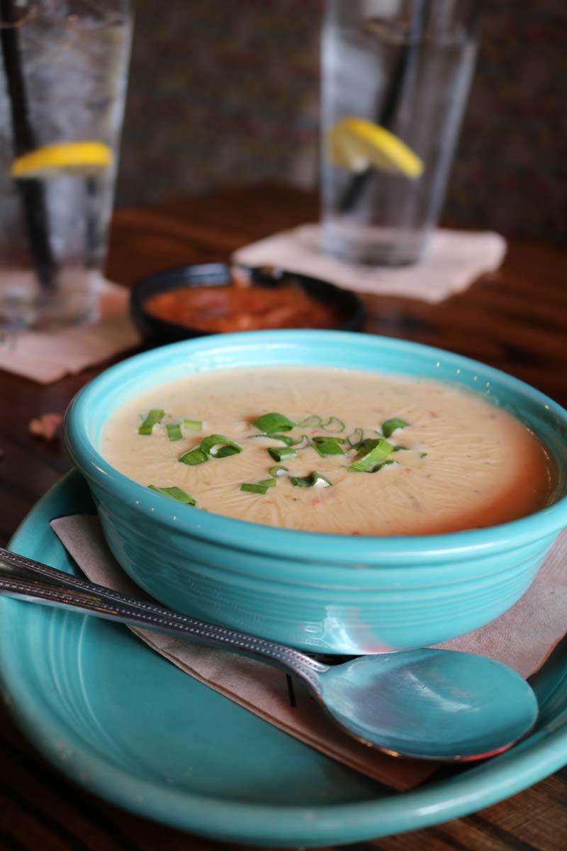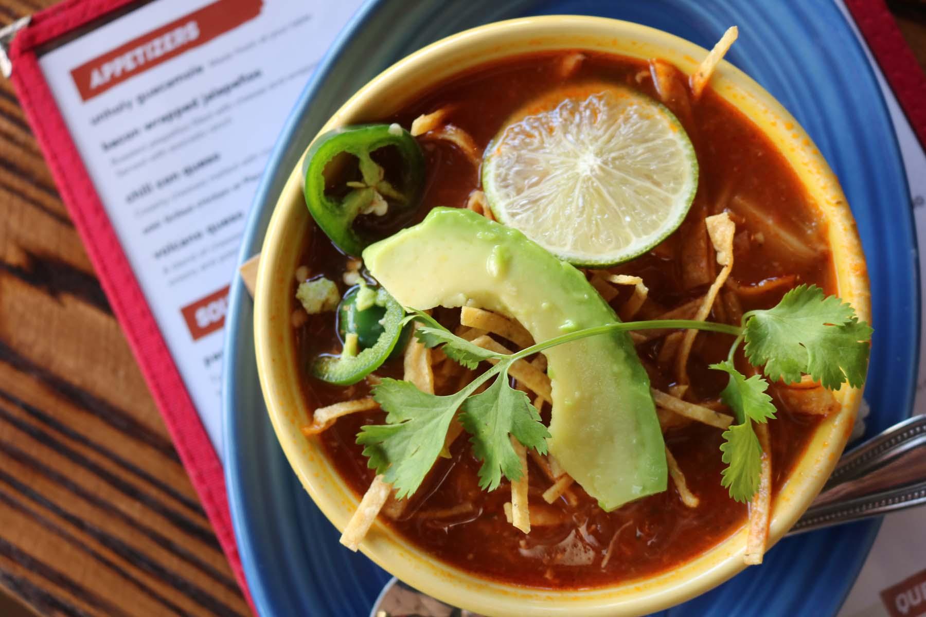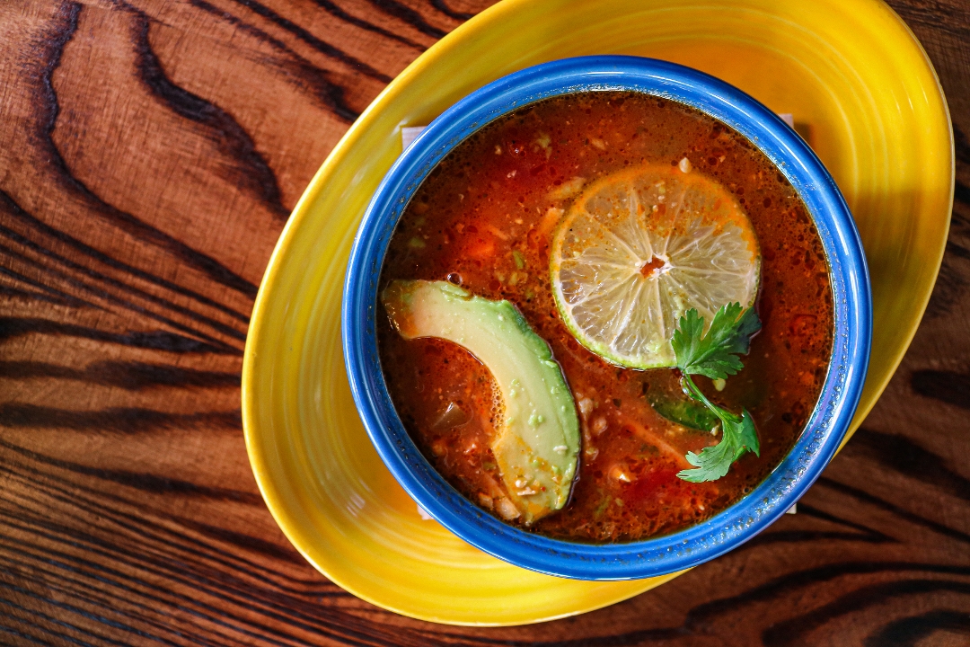 made with poached chicken, carrots, tomatoes, potatoes and chilies. Garnished with cilantro, avocado, jalapeno, lime and tortilla strips