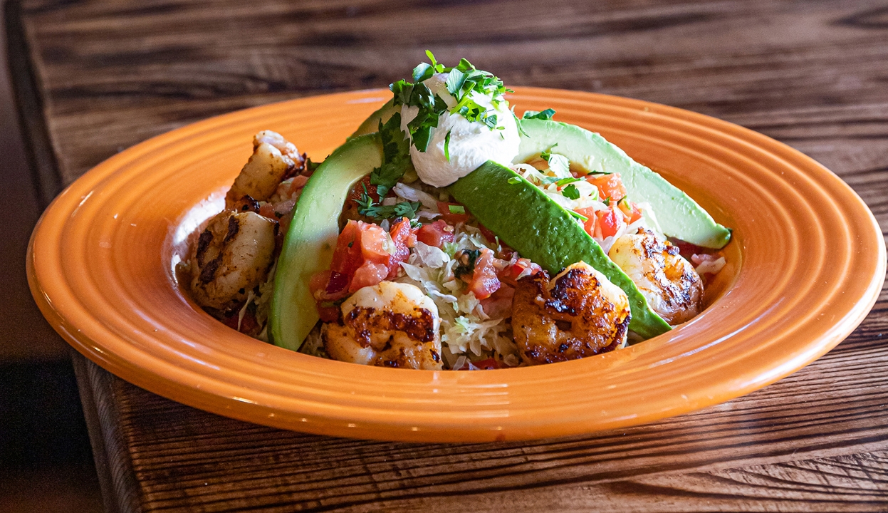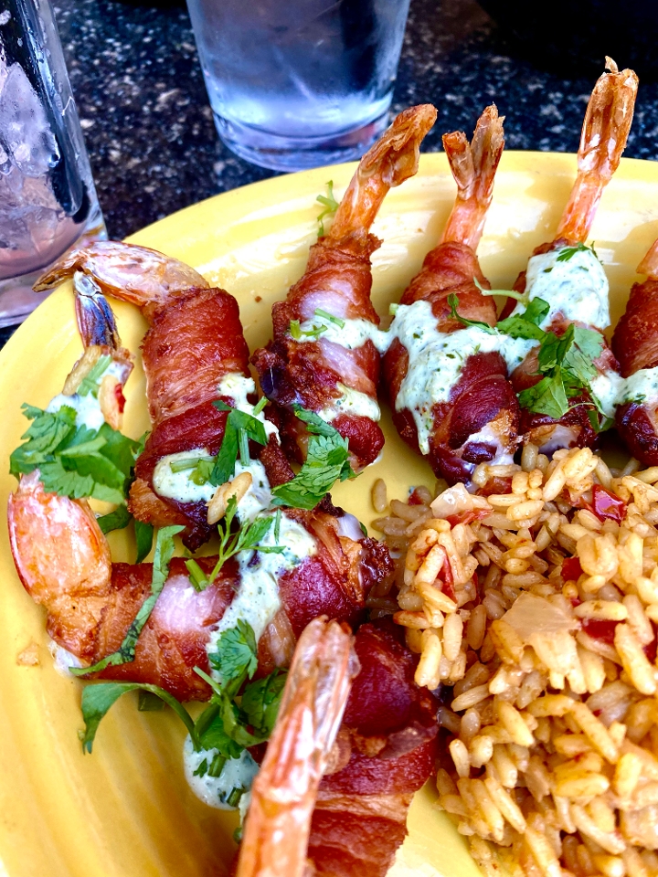 bacon wrapped shrimp stuffed with monterey jack cheese, flash fried to perfection and drizzled with jalapeño crema. Served with red rice and citrus chipotle slaw