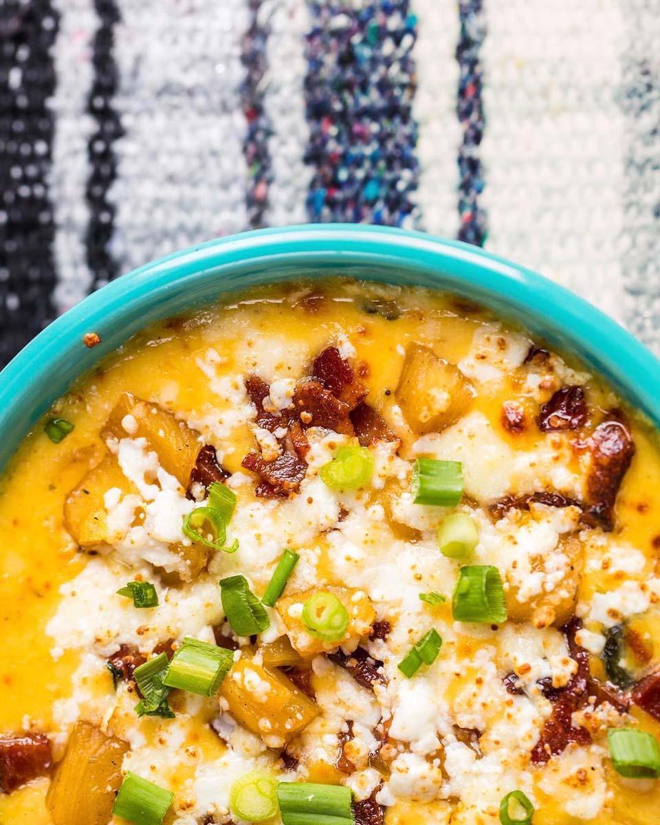 a blend of cheeses melted with pineapple, bacon, onion and poblano peppers