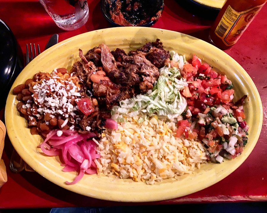 braised pork served with lettuce, Johnny pico, mixed cheese, pickled onions, homemade flour tortillas, red rice, charro beans and queso fresco